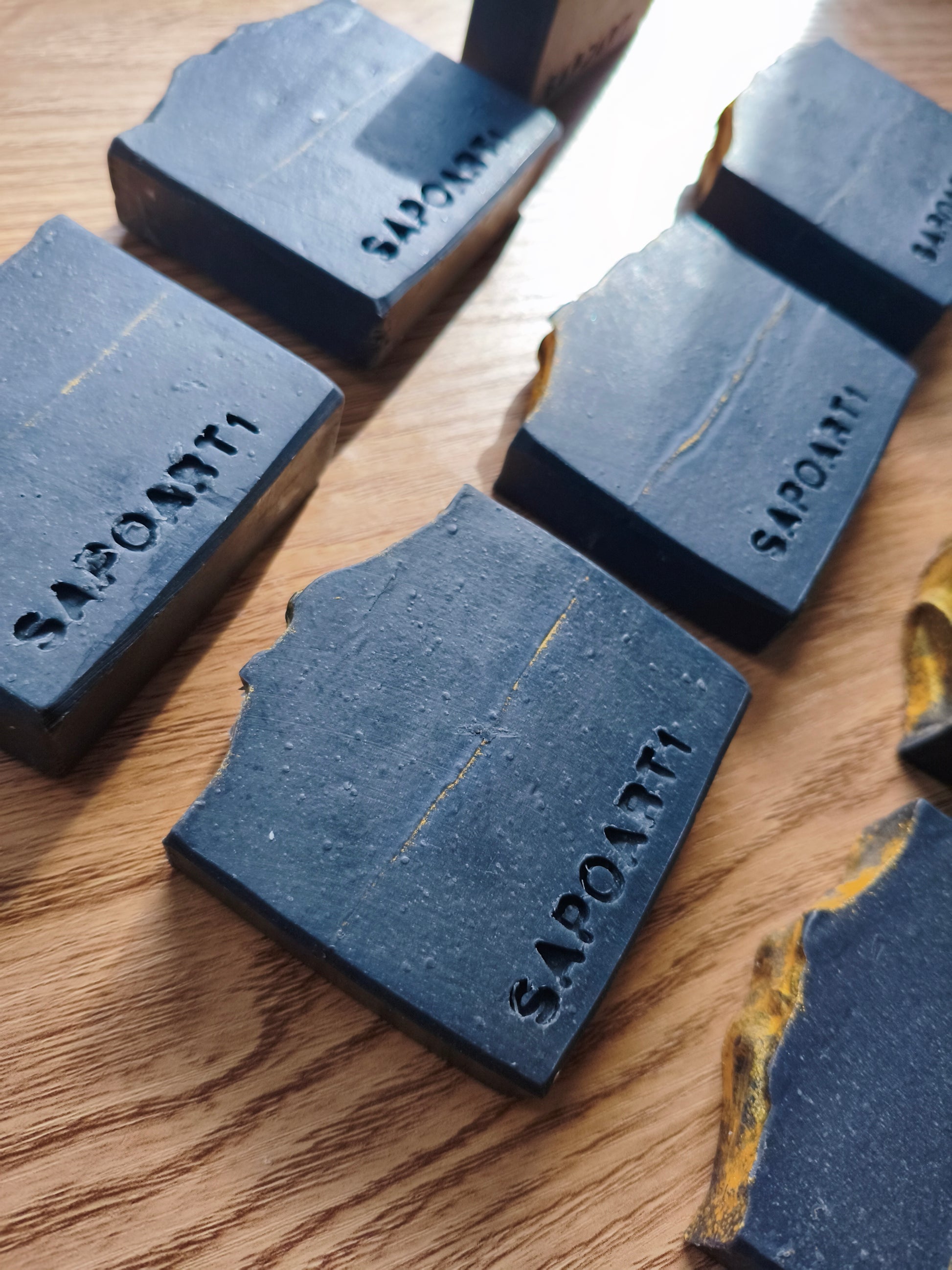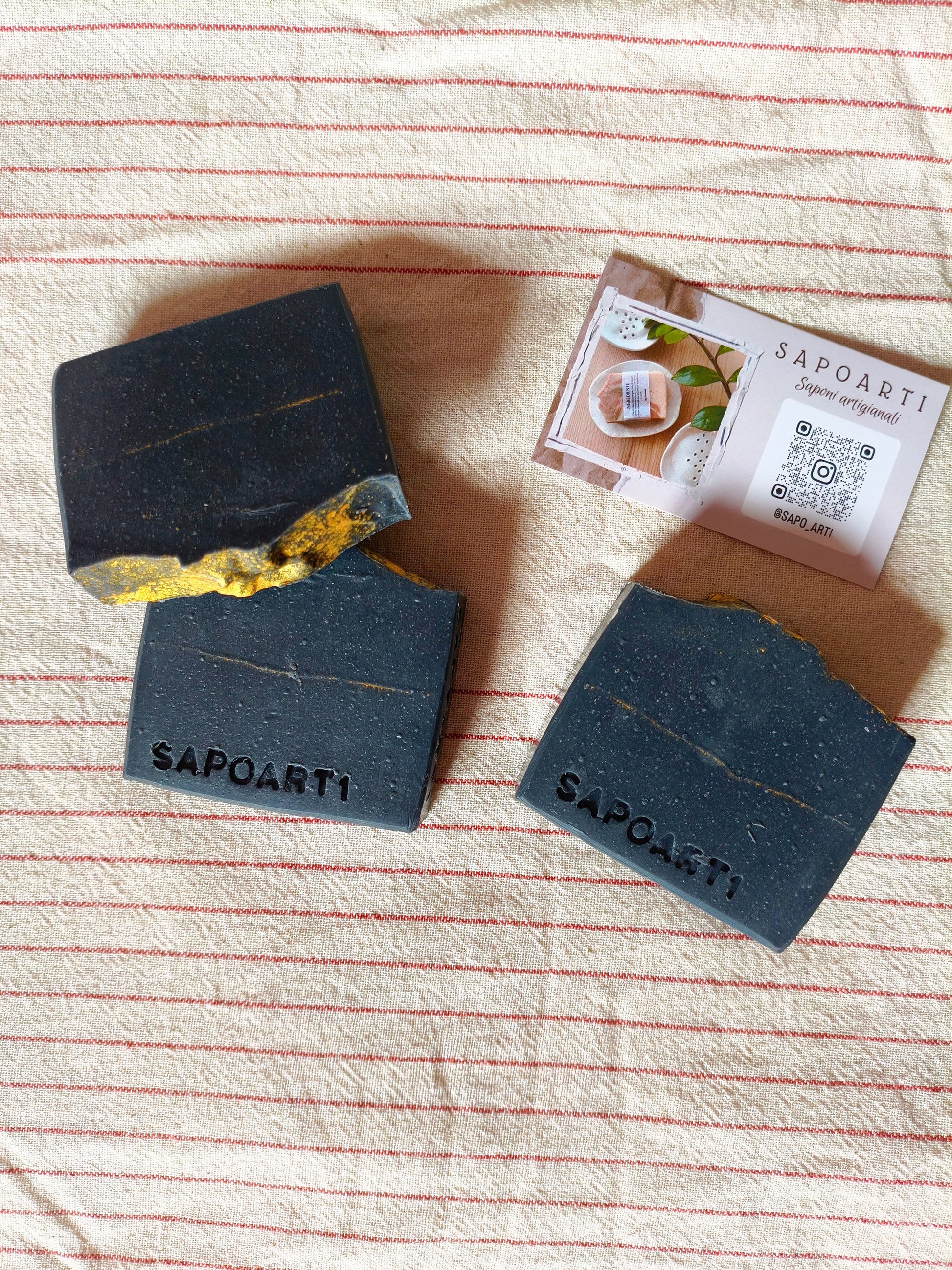Olio d'oliva, olio di cocco, burro di karité, olio al girasole, idrossido di sodio, acqua distillata, carbone attivo, olio essenziale al patchouli.