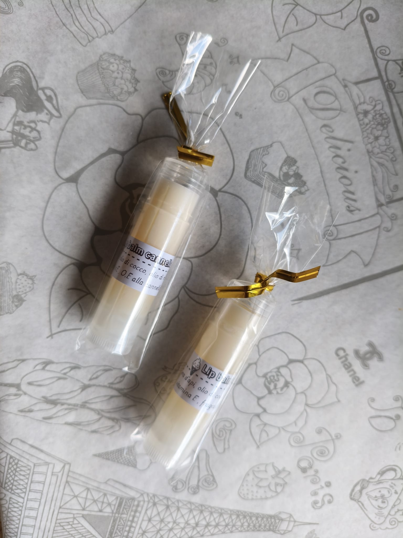 Ingredienti; cera d'api, olio di cocco, olio di mandorle, vitamina E, ed oli essenziali o fragranza cosmetica.